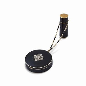 PORTACIPRIA CON FIALETTA PORTAPROFUMO in oro 14kt, rivestiti in smalto nero, portacipria circolare di dim. cm [..]