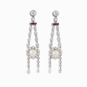 PAIO DI ORECCHINI PENDENTI CON PERLE RUBINI E DIAMANTI in oro bianco 18kt, con pendenti a forma di fiore impreziositi [..]