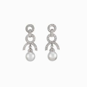 PAIO DI ORECCHINI PENDENTI CON PERLE E DIAMANTI in oro bianco 18kt, realizzati a catena e impreziositi da diamanti [..]