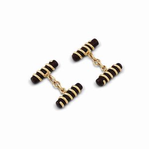 REZA PAIO DI GEMELLI A SPIRALE in legno e oro giallo 18kt, a forma di cilindri cinti da un motivo a spirale, punzoni [..]