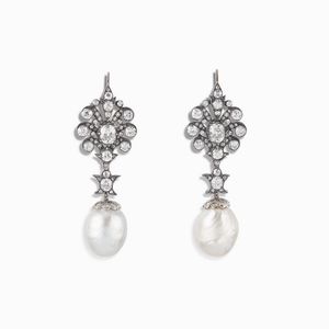 PAIO DI ORECCHINI PENDENTI CON PERLE NATURALI E DIAMANTI in oro e argento, realizzati a forma di tralci impreziositi [..]