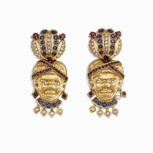 PAIO DI ORECCHINI PENDENTI CON PIETRE DI COLORE E DIAMANTI in oro giallo 18kt, raffiguranti dei volti con copricapi [..]