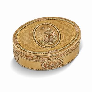 SCATOLA PORTACIPRIA in oro quattro colori 18kt, di forma ovale, lavorata a guilloché e rifinita lungo [..]