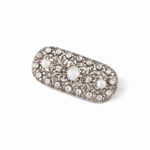 SPILLA A TRALCIO CON PERLE E DIAMANTI in argento e oro, traforata seguendo un motivo a tralci, impreziosita da [..]