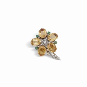 SPILLA A FORMA DI FIORE CON TOPAZI GIALLI SMERALDI E DIAMANTI in oro giallo 18kt e platino, impreziosita da cinque [..]