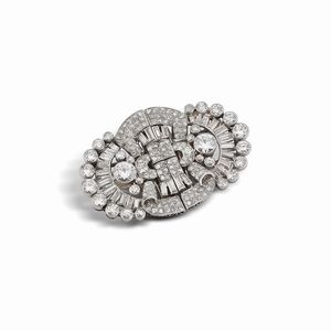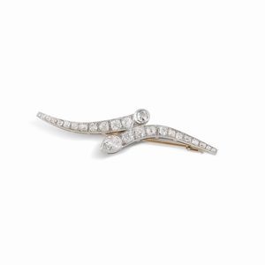 SPILLA A DOPPIA CLIP CON DIAMANTI in oro 14kt e platino, realizzata seguendo un motivo a volute, impreziosita [..]
