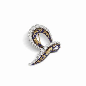 SPILLA A FIOCCO CON DIAMANTI in platino e oro giallo 18kt, decorata in smalto con raffigurati motivi floreali, [..]