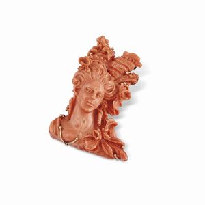 SPILLA IN CORALLO INCISO composto da rametto in corallo inciso raffigurante un volto femminile cinto da tralci [..]