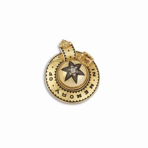 SPILLA COMMEMORATIVA in oro giallo 14kt, decorata in smalto, realizzata a forma di disco cinta da una cintura, [..]