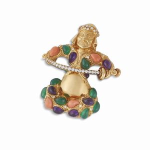 SPILLA/PENDENTE "SAMURAI" CON PIETRE DI COLORE E DIAMANTI in oro giallo 18kt, raffigurante un samurai [..]