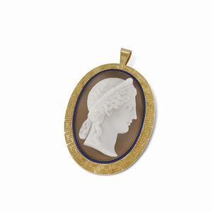SPILLA/PENDENTE CON CAMMEO in giallo 18kt e profilo decorato in smalto blu, al centro un cammeo in calcedonio [..]