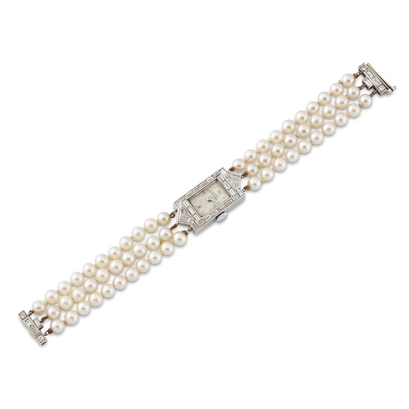GIRARD PERREGAUX OROLOGIO DA DONNA cassa rettangolare in platino, quadrante bianco firmato "Girard Perregaux", numeri arabi, ghiera e fermatura impreziosite da diamanti taglio fantasia, movimento a carica manuale, bracciale a tre fili di perle di mm 5 circa, lungh. cm 15,5, gr. 29