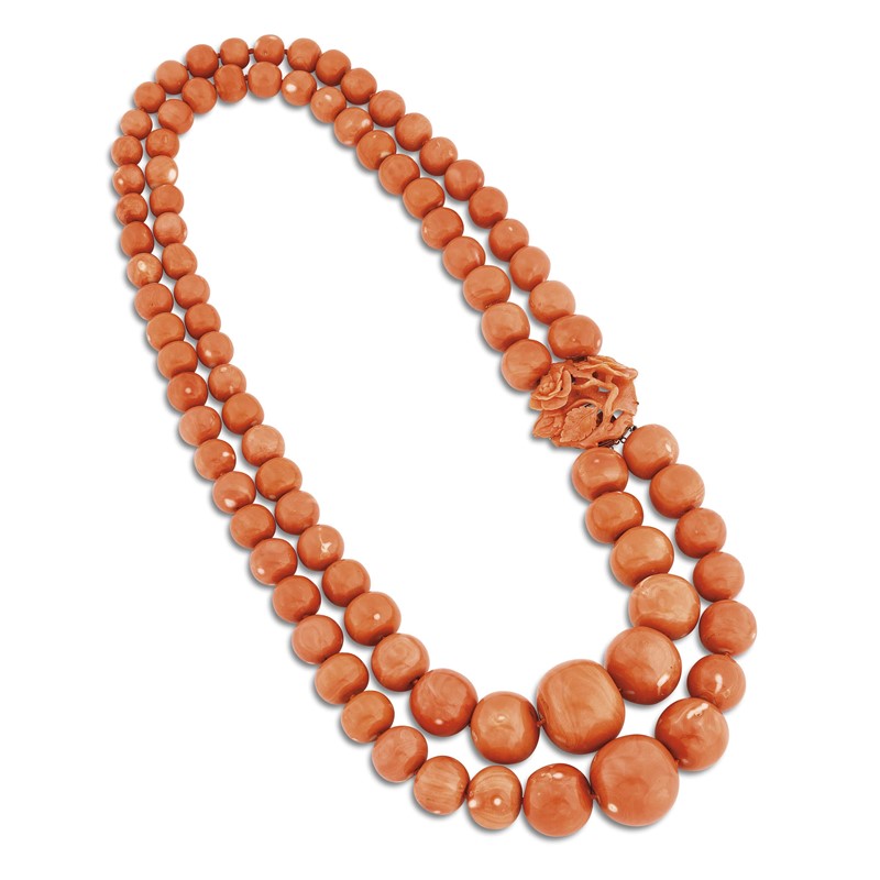 composta da un doppio filo di sfere digradanti in corallo di mm 26-12 circa, fermatura in oro giallo 18kt e corallo intagliato raffigurante un motivo floreale, lungh. cm 65, gr. 518
