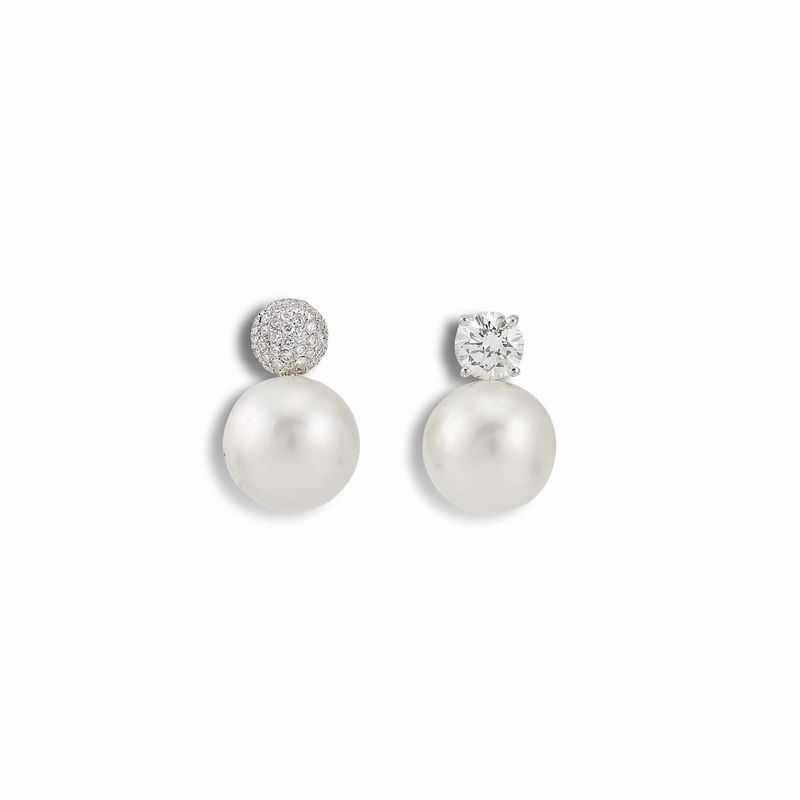 MASSONI PAIO DI ORECCHINI CON PERLE SOUTH SEA E DIAMANTI in oro bianco 18kt, composti da perle di mm 15 circa, di cui uno impreziosito da pavé di diamanti taglio brillante per ct 1 circa e uno sormontato da un diamante taglio brillante di ct 1.90 circa, firmati "Massoni", dim. cm 1,5x2 circa, gr. 19 complessivi