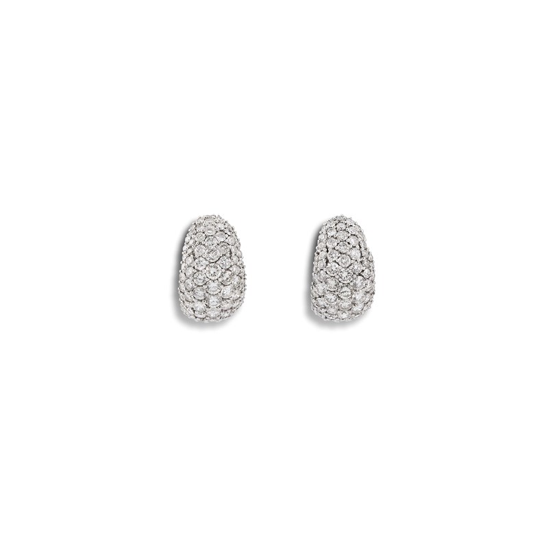 in oro bianco 18kt, realizzati a fascia bombata, impreziositi da pavé di diamanti taglio brillante per ct 10 circa, chiusura a clip con perno, dim. cm 1,5x2,5, gr. 26 complessivi