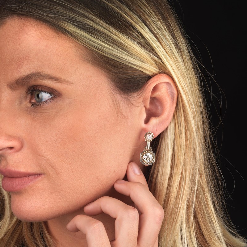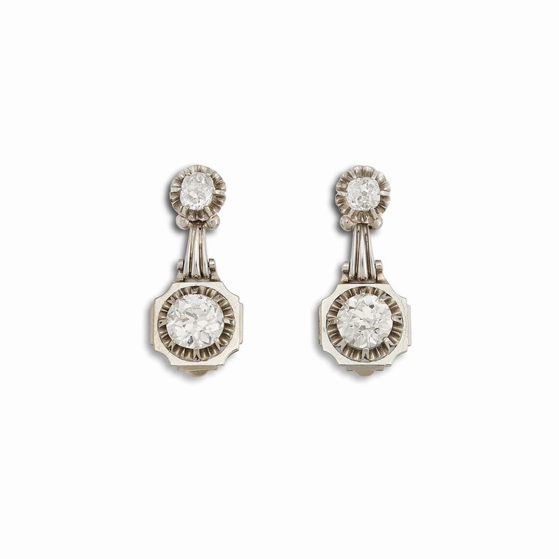 PAIO DI ORECCHINI CON DIAMANTI in oro bianco 18kt, impreziositi da due diamanti taglio vecchio per ct 4.30 circa e da due diamanti taglio antico per ct 1.40 circa, punzoni 750 e del fabbricante, dim. cm 1,5x3, chiusura a farfallina, gr. 9 complessivi
