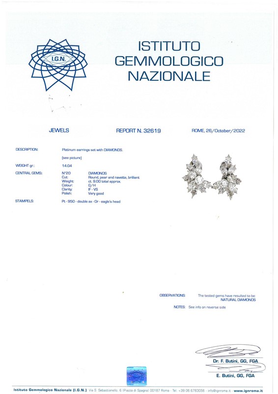 in platino, impreziositi da diamanti taglio navette, brillante e a goccia per ct 9 circa, colore G/H, purezza IF/Vs, punzone Or e PT 950, dim. cm 1,5x2,5, gr. 14. Corredati di certificato IGN del 26/10/2022 attestante le caratteristiche.