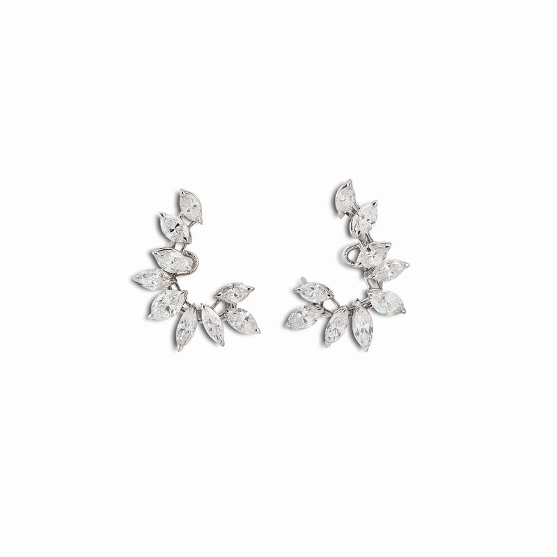 in oro bianco 18kt, realizzati seguendo un motivo a tralcio per ct 5.60 circa, dim. cm 2x2,5, chiusura a clip e a farfallina, gr. 10 complessivi