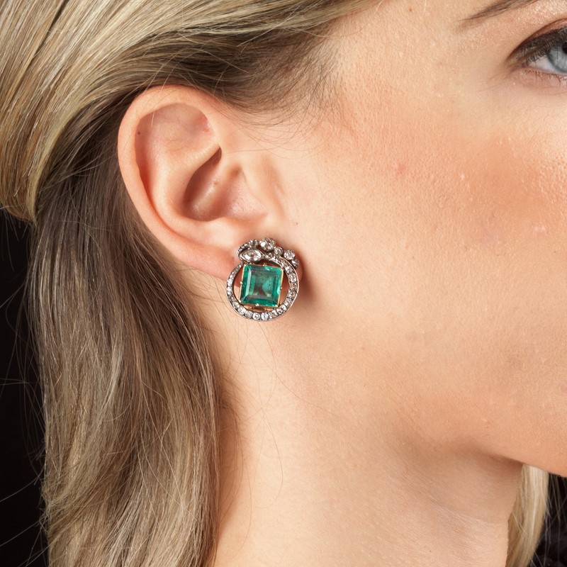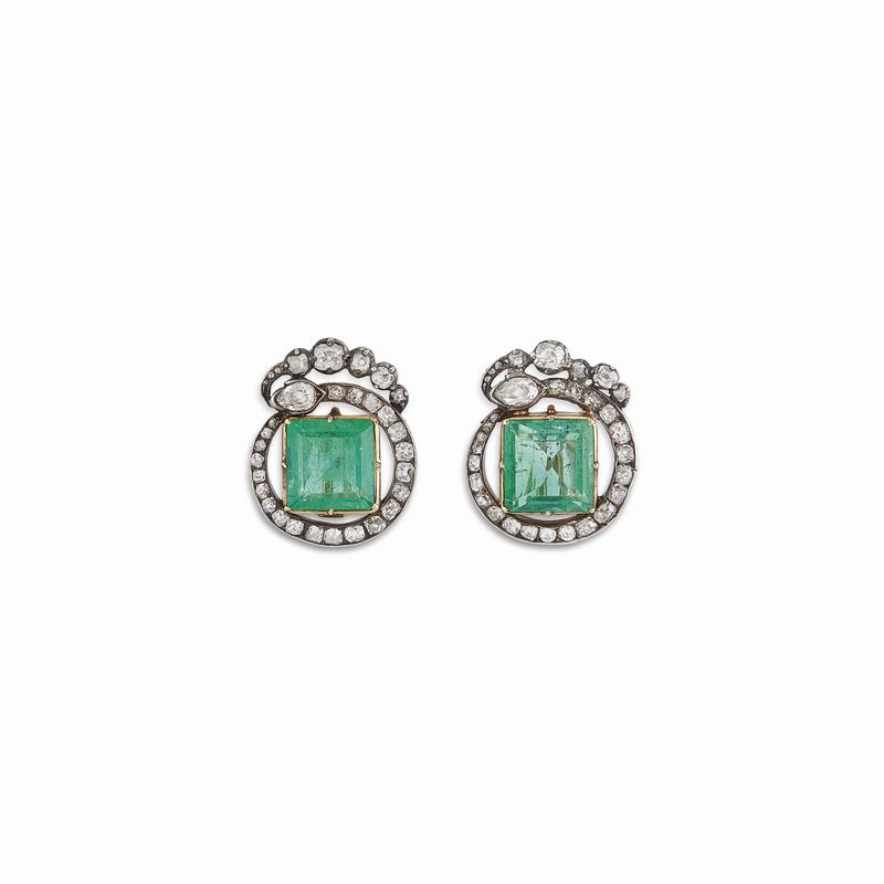 PAIO DI ORECCHINI CON SMERALDI E DIAMANTI in oro e argento, impreziositi al centro da smeraldi taglio quadrato per ct 6 circa, cinti da diamanti taglio vecchio per ct 2 circa, dim. cm 2x2, gr. 9 complessivi