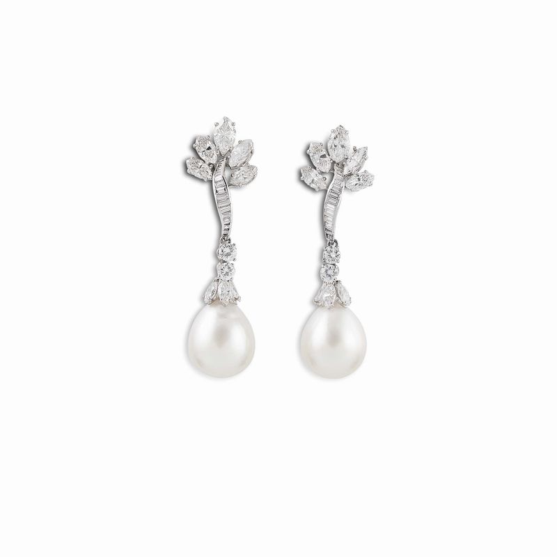 PAIO DI ORECCHINI PENDENTI CON PERLE E DIAMANTI in oro bianco 18kt, impreziositi da diamanti taglio navette, baguette e brillante per ct 6 circa, da cui pendono due perle a goccia di mm 15x13 circa, dim. cm 1,5x5, chiusura a clip con perno, gr. 18 complessivi