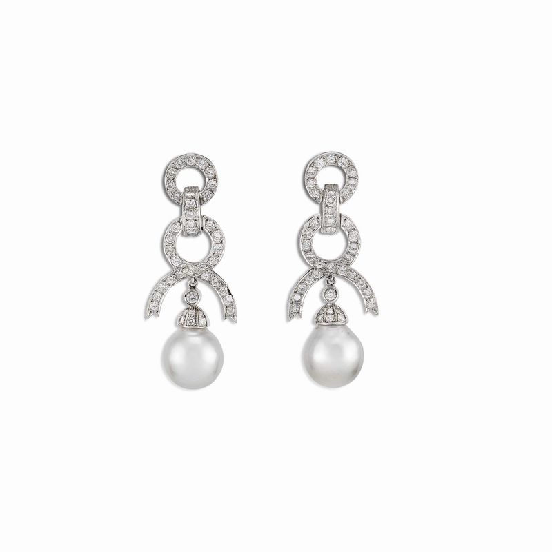 PAIO DI ORECCHINI PENDENTI CON PERLE E DIAMANTI in oro bianco 18kt, realizzati a catena e impreziositi da diamanti taglio brillante (uno mancante) per ct 1.30 circa, da cui pendono due perle di mm 13x11 circa, punzone 750, dim. cm 1,5x4,5, chiusura a clip con perno, gr. 16 complessivi