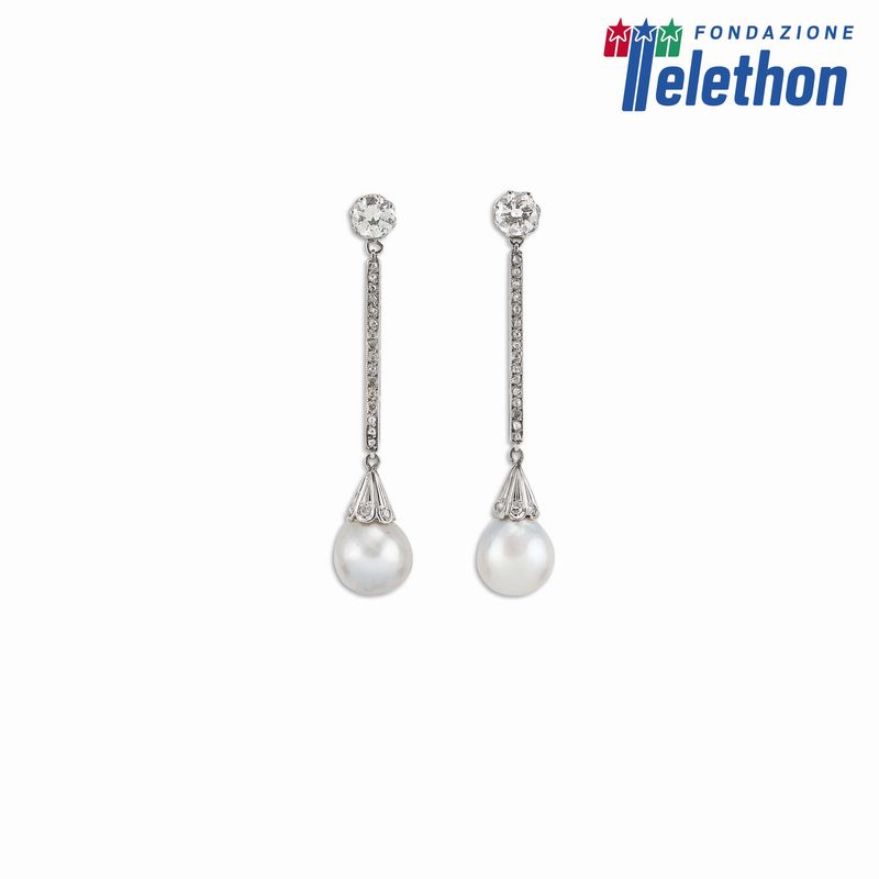 PAIO DI ORECCHINI PENDENTI CON PERLE E DIAMANTI in oro bianco 18kt, da cui pendono perle di mm 9 circa, impreziositi da due diamanti taglio rotondo per ct 1 circa e rose di diamante (alcune mancanti), dim. cm 1x4,5, gr. 6 complessivi