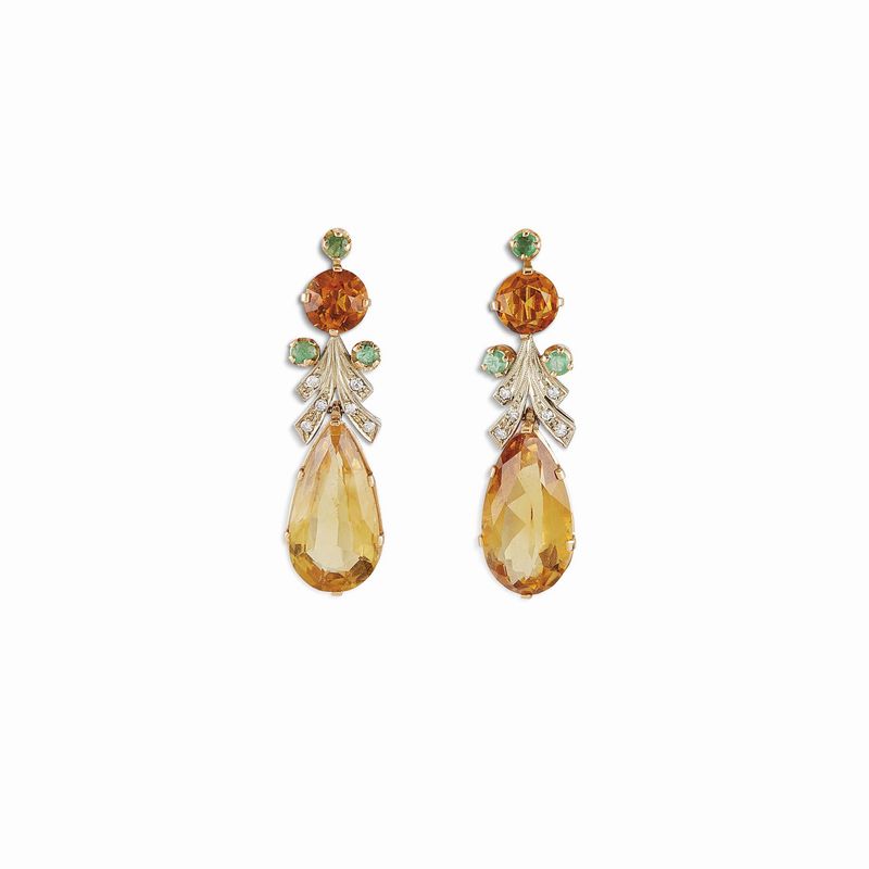 PAIO DI ORECCHINI PENDENTI CON PIETRE DI COLORE E DIAMANTI in oro giallo, rosa e bianco 18kt, impreziositi da due quarzi citrini taglio rotondo e due taglio fantasia di mm 18x9x6 circa, smeraldi taglio rotondo per ct 0.20 circa e diamanti taglio huit huit per ct 0.10 circa, dim. cm 1x4, gr. 11 complessivi