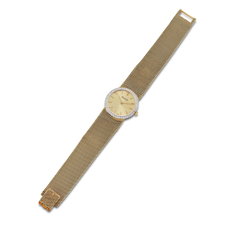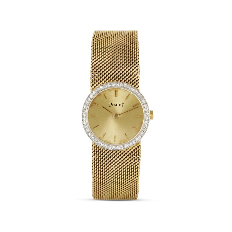 cassa in oro giallo e bianco 18kt, quadrante oro con indici applicati, firmato "Piaget", con ghiera di diamanti per ct 0.40 circa, movimento a carica manuale, bracciale integrato a maglia tessita in oro giallo 18kt, punzone 750, lungh. cm 16,5, gr. 50