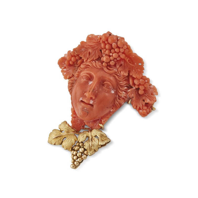 in oro giallo 18kt e corallo inciso, raffigurante il volto di bacco coronato da tralci di vite, dim. cm 4x5, gr. 24