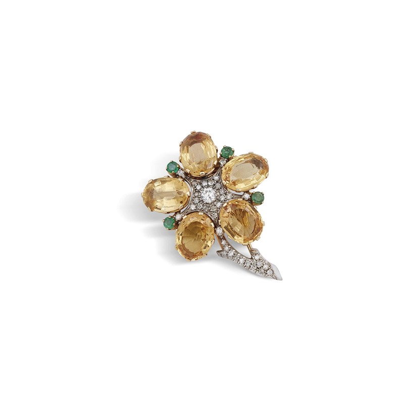 SPILLA A FORMA DI FIORE CON TOPAZI GIALLI SMERALDI E DIAMANTI in oro giallo 18kt e platino, impreziosita da cinque topazi gialli taglio ovale per ct 27 circa, quattro smeraldi taglio rotondo per ct 0.60 circa e diamanti taglio brillante e huit huit per ct 0.60 circa, dim. cm 3,5x5, gr. 20. Corredato di certificato IGN del 26/10/2022 attestante l'assenza di trattamenti termici sui topazi.