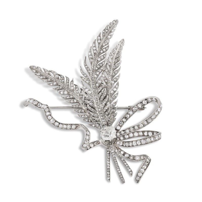 in argento, impreziosita da rose di diamante (una mancante), con al centro un diamante taglio antico di ct 2 circa, dim. cm 6x9 circa, gr. 26