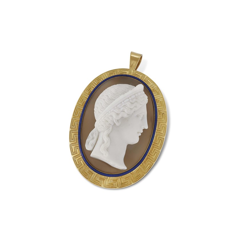 SPILLA/PENDENTE CON CAMMEO in giallo 18kt e profilo decorato in smalto blu, al centro un cammeo in calcedonio con soggetto di età classica inciso e incorniciato da una greca, punzoni francesi, dim. cm 3,5x4,5, gr. 21