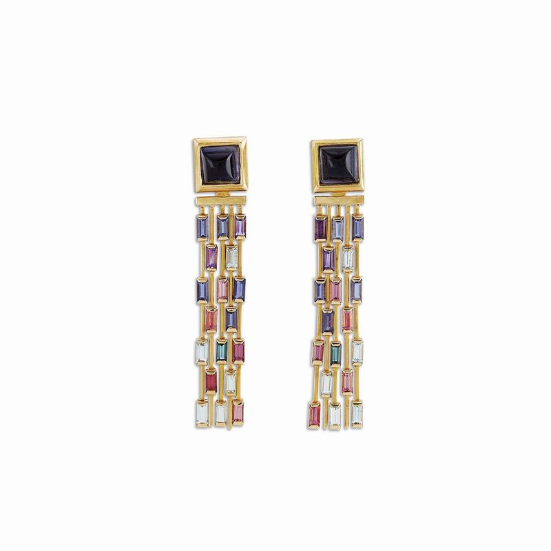 in oro giallo 18kt, realizzati a frange pendenti, impreziositi da pietre semipreziose, firmati "Tiffany & Co", punzone 750, dim. cm 1x5,5, chiusura a clip con perno, gr. 15 complessivi