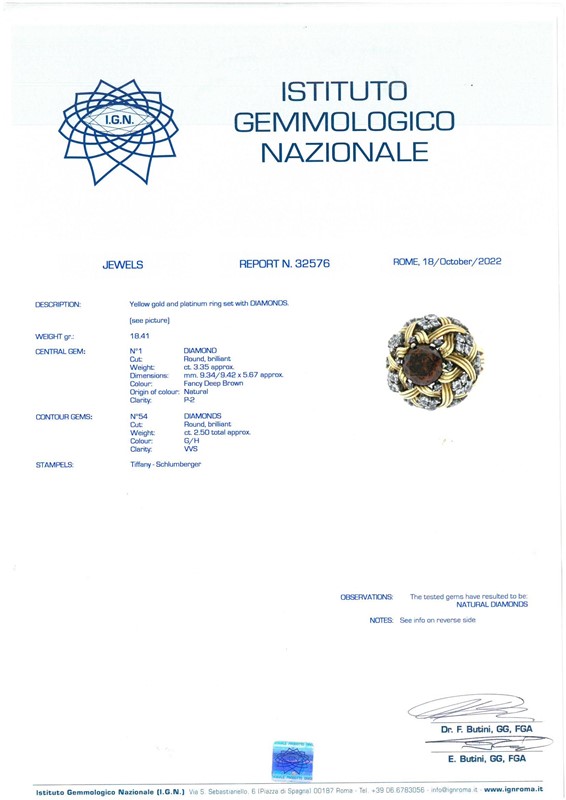 in oro giallo 18kt e platino, realizzato seguendo un motivo a fasci intrecciati, impreziosito da diamanti taglio brillante per ct 2.50 circa, colore G/H, purezza Vvs, sulla sommità un diamante taglio brillante di ct 3.35 circa, colore fancy deep brown, purezza P2, firmato "Tiffany Schlumberger", mis. 50, gr. 18. Corredato di certificato IGN del 18/10/2022 attestante le caratteristiche.