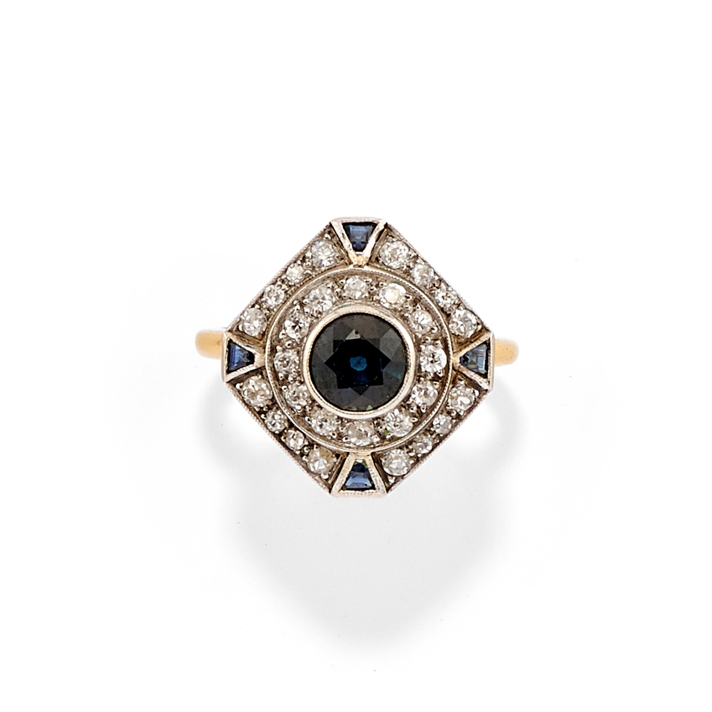 a disegno geometrico con al centro zaffiro taglio rotondo e doppia cornice in diamanti taglio huit-huit.