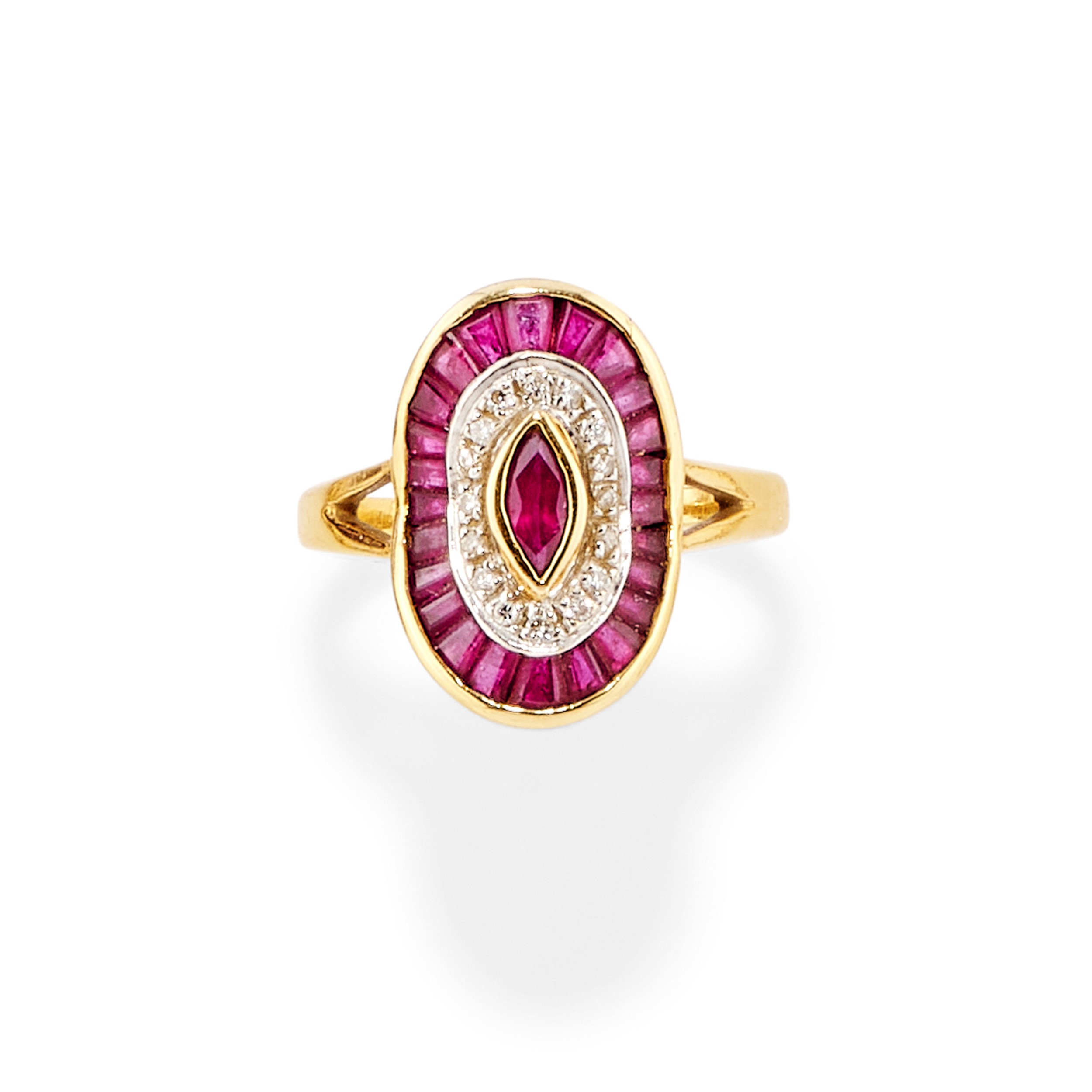 di forma ovale con rubini taglio baguette e navette per totale ct 0,80 circa, piccoli diamanti taglio brillante a decoro.
