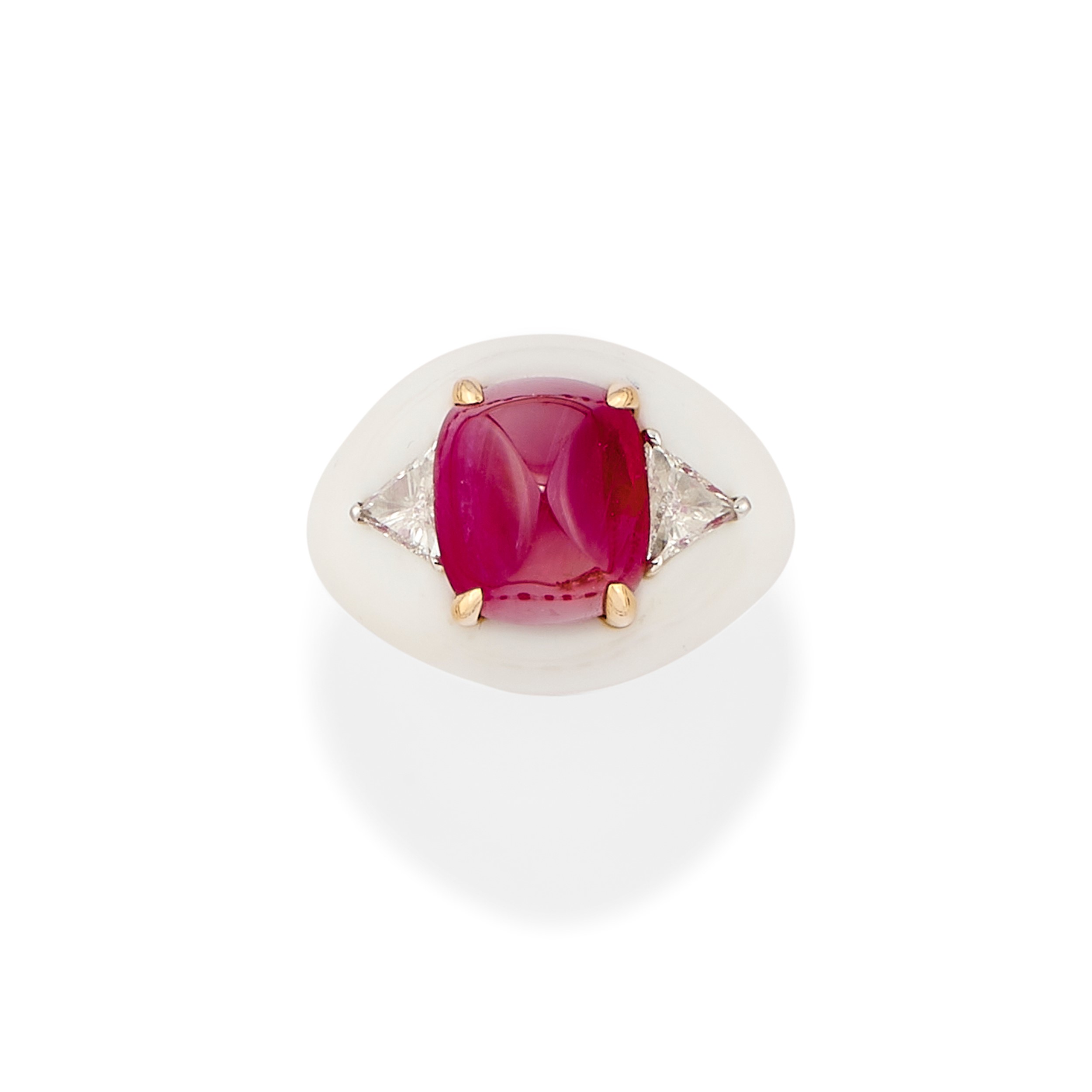 bombato in ceramica bianca, al centro rubino Burma di forma a cuscino taglio cabochon-sugar loaf di ct 13,07 circa, ai lati due diamanti taglio triangolare per totale ct 1,00 circa, interno in oro rosso, con astuccio.