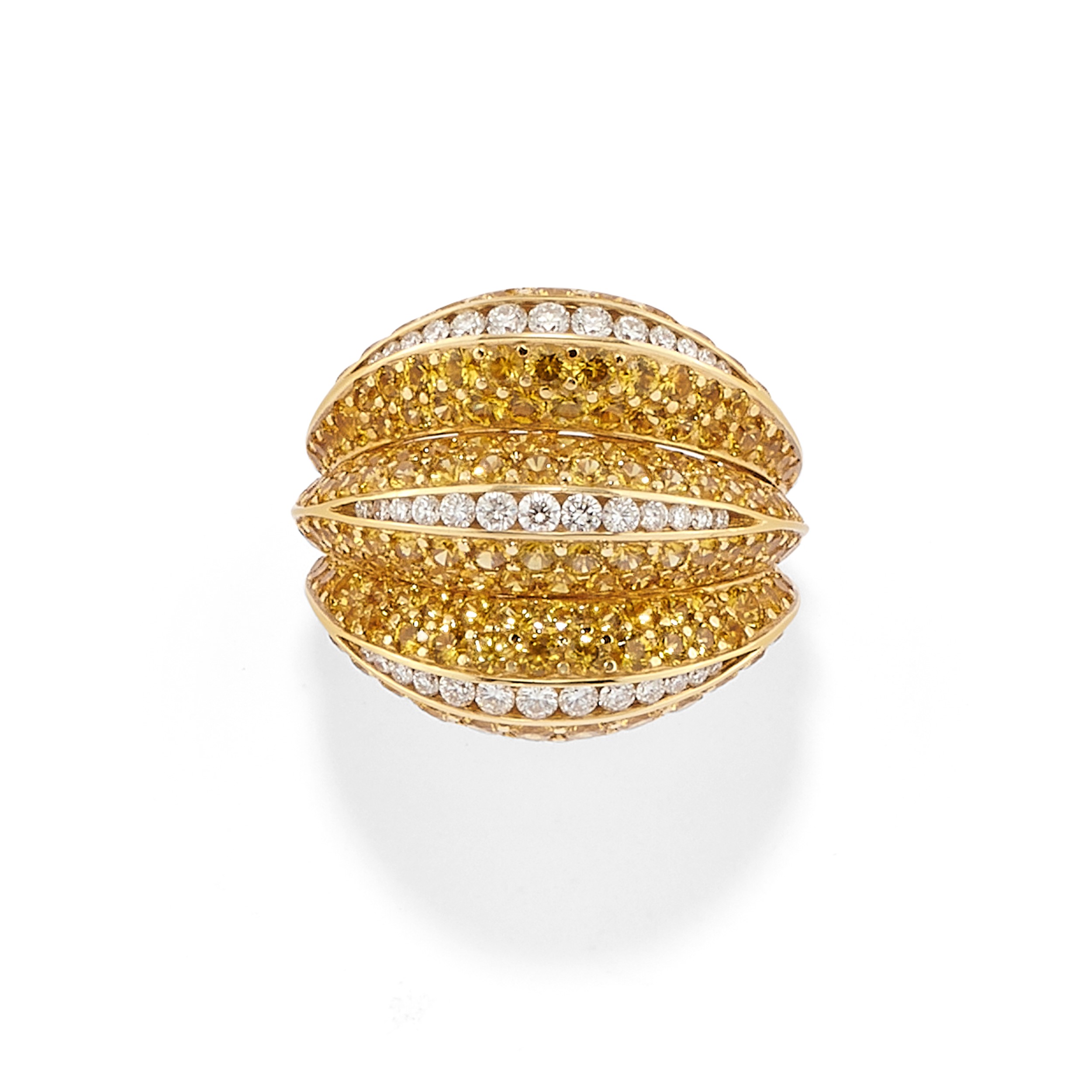Anello in oro giallo 18k, zaffiri gialli e diamanti