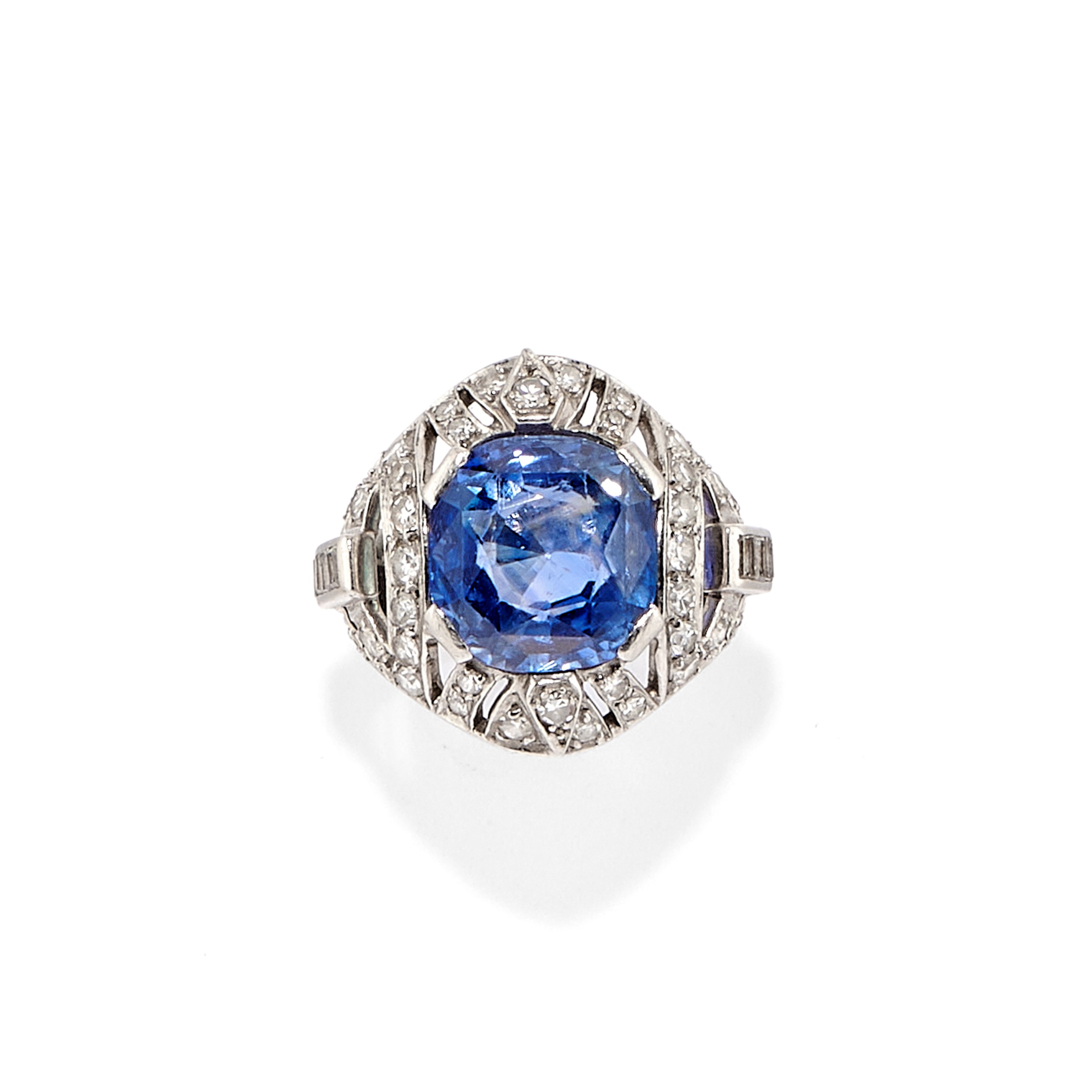 Anello in platino, zaffiro e diamanti, 1930 circa