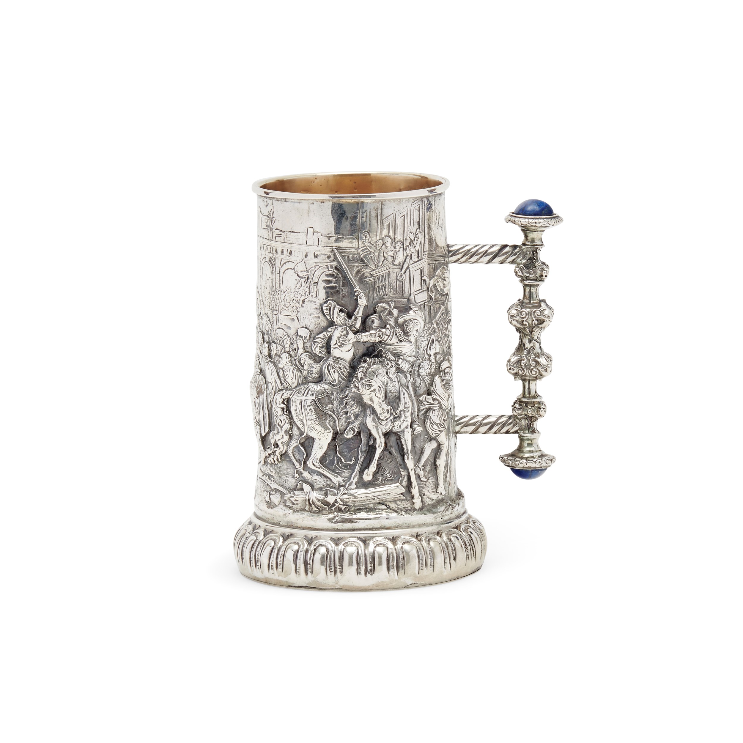 di forma cilindrica con corpo sbalzato rappresentante l'entrata a Parigi di Enrico IV, manico con lapislazzuli tondi cabochon.