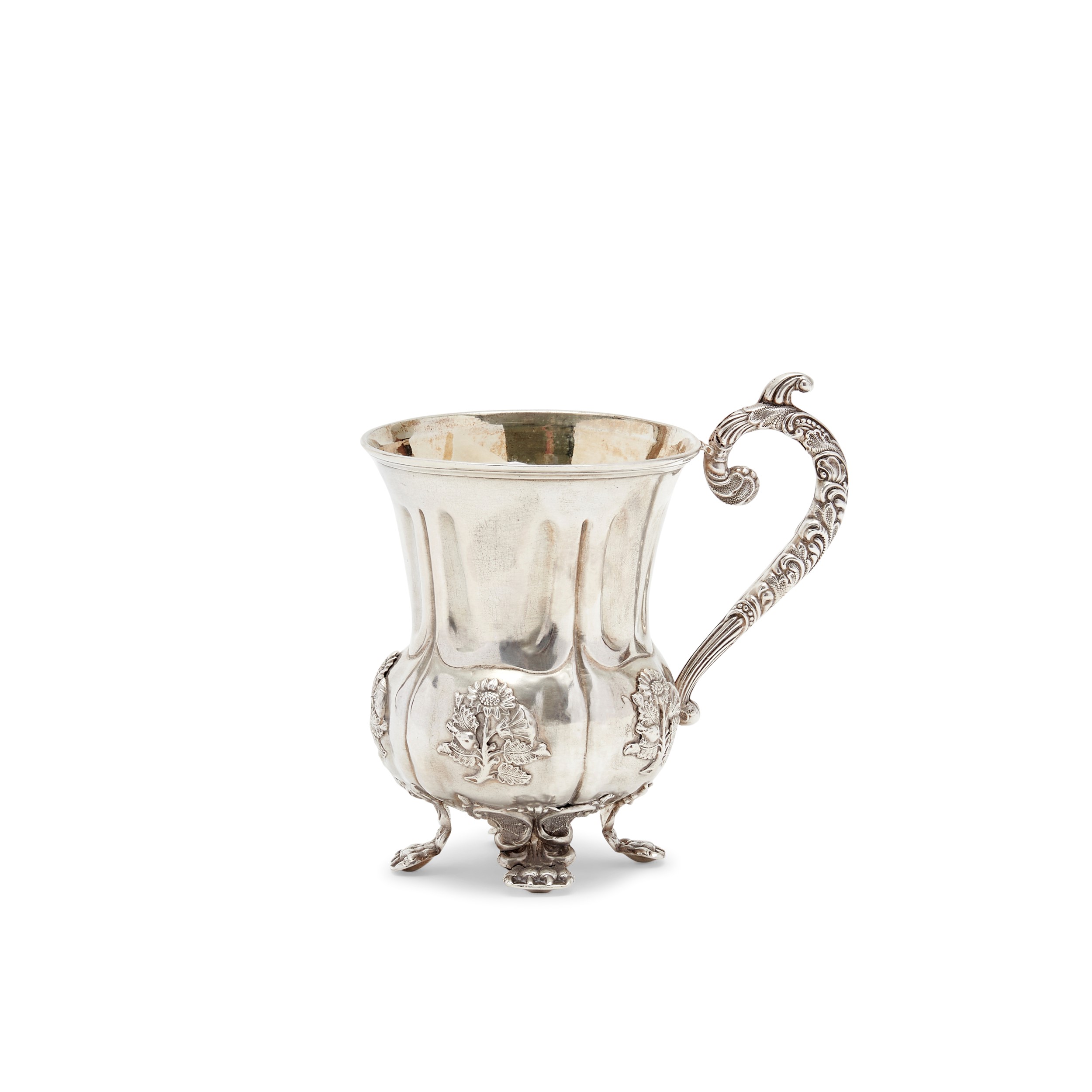 corpo con decori floreali, poggiante su quattro piedi zoomorfi, manico mosso, interno in vermeil.
