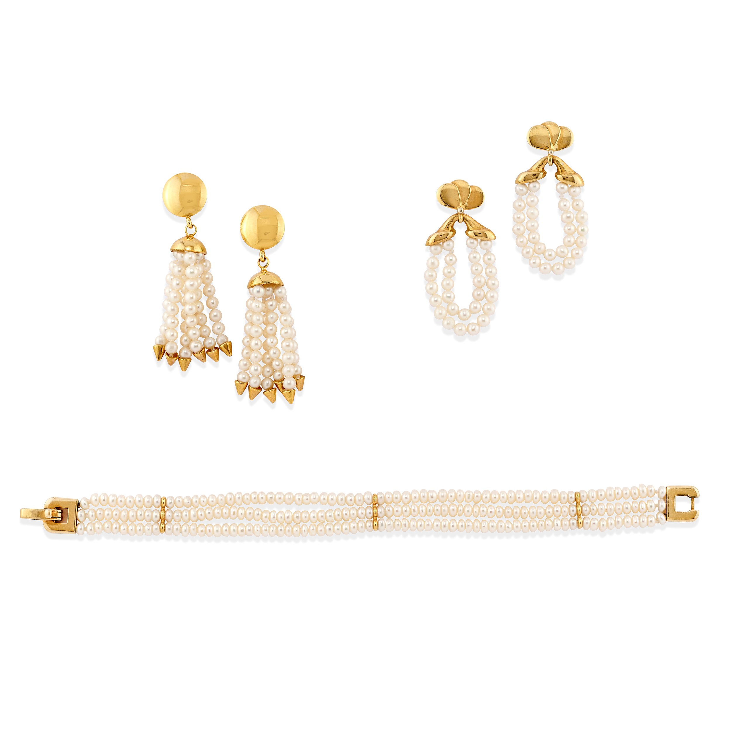 Bracciale e due coppie di orecchini in oro giallo 18K e perle coltivate d'acqua [..]