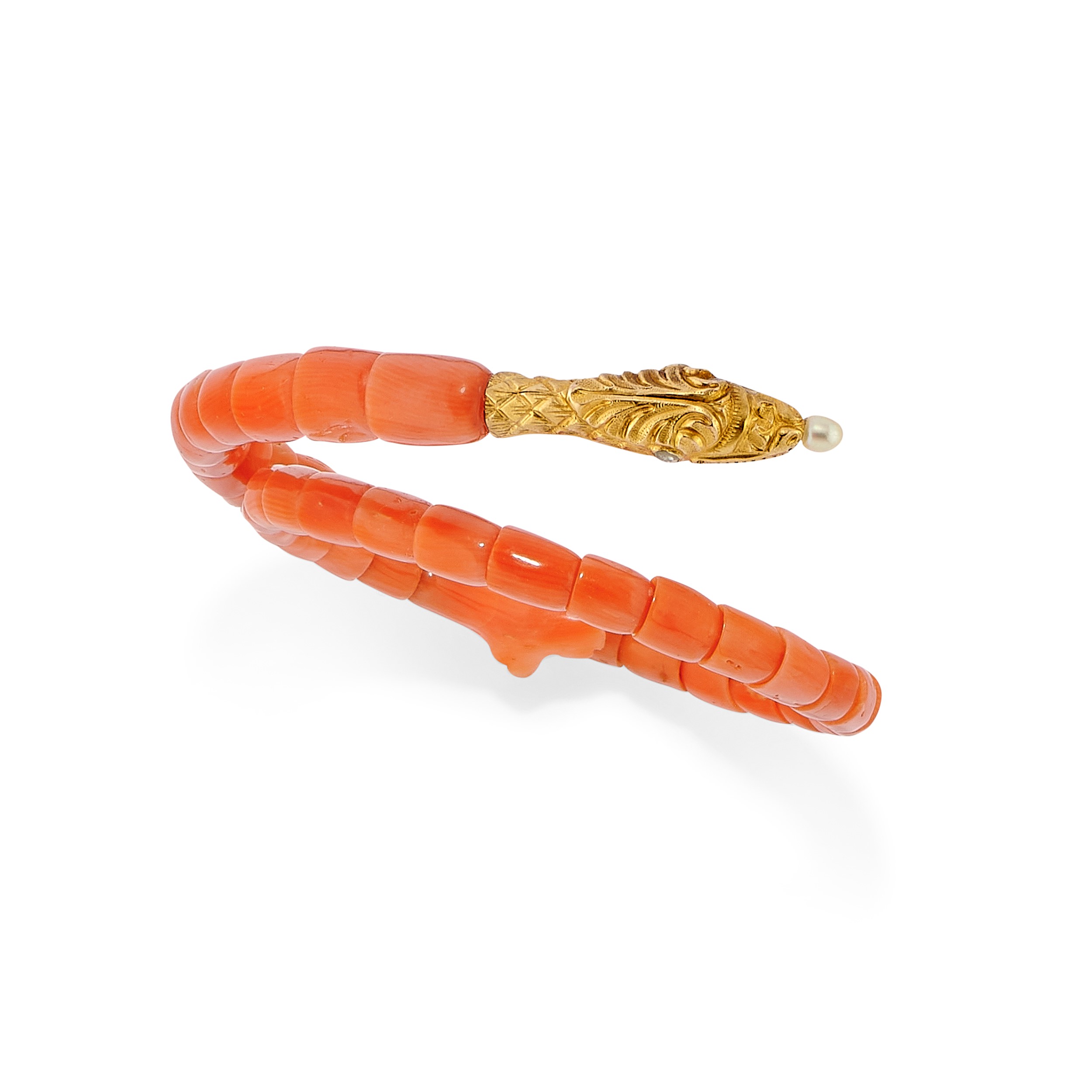 Bracciale in oro giallo 18k, corallo, perla coltivata e pietre sintetiche