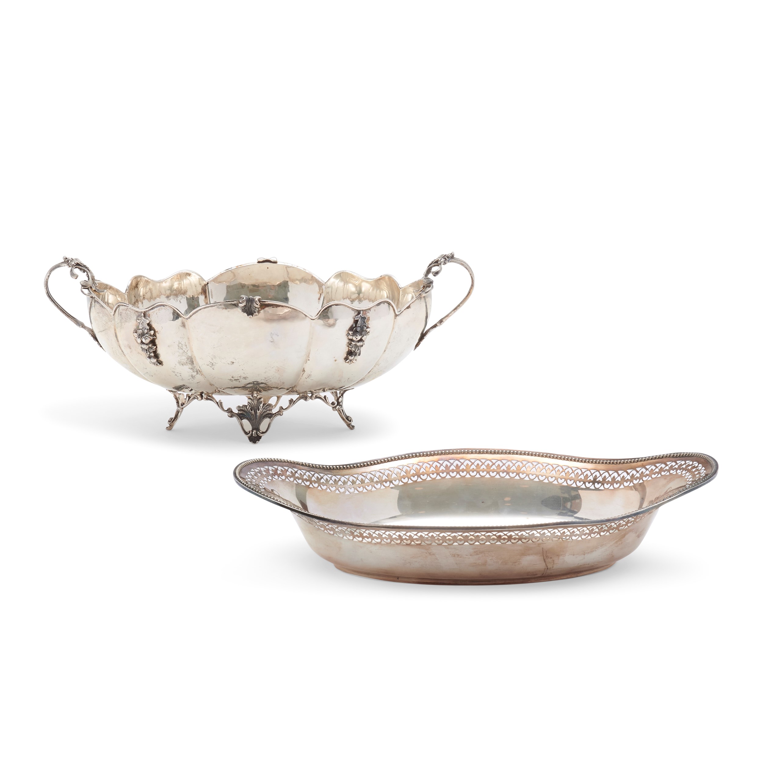 centrotavola di forma polilobata con manici e applicazioni floreali e cestino di forma ovale con bordo traforato.