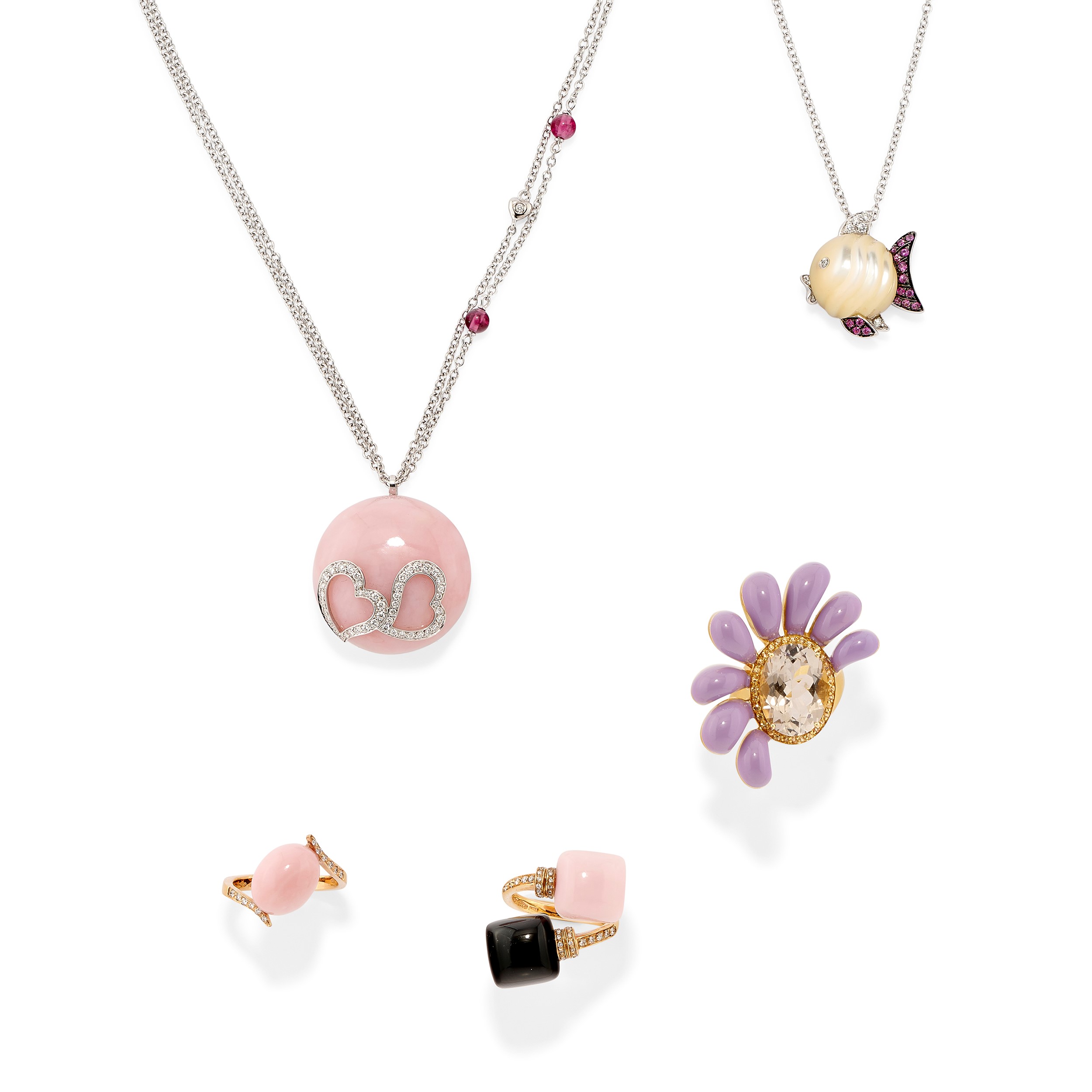Cinque gioielli in oro bicolore 18k, diamanti, zaffiri, pietre due e smalti
