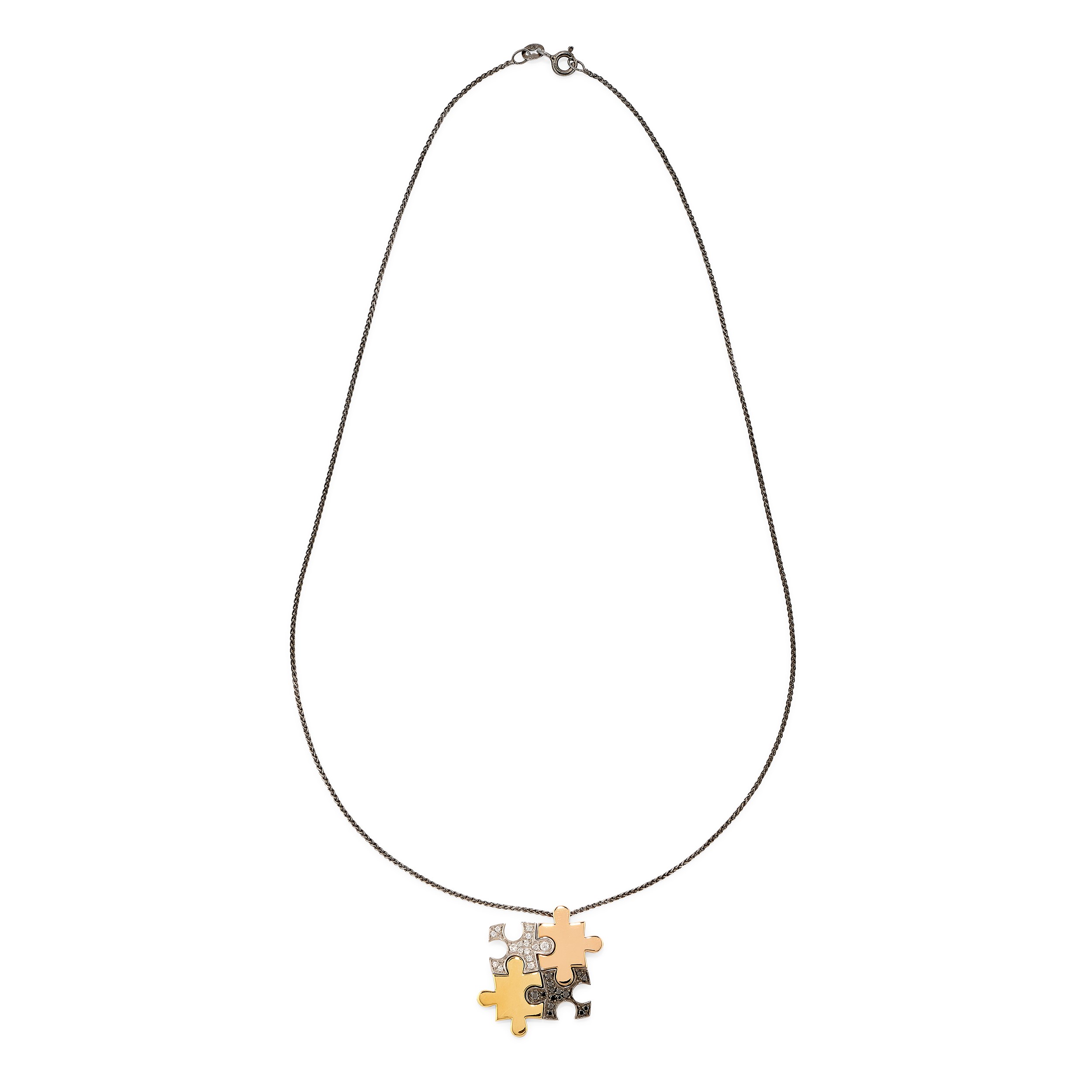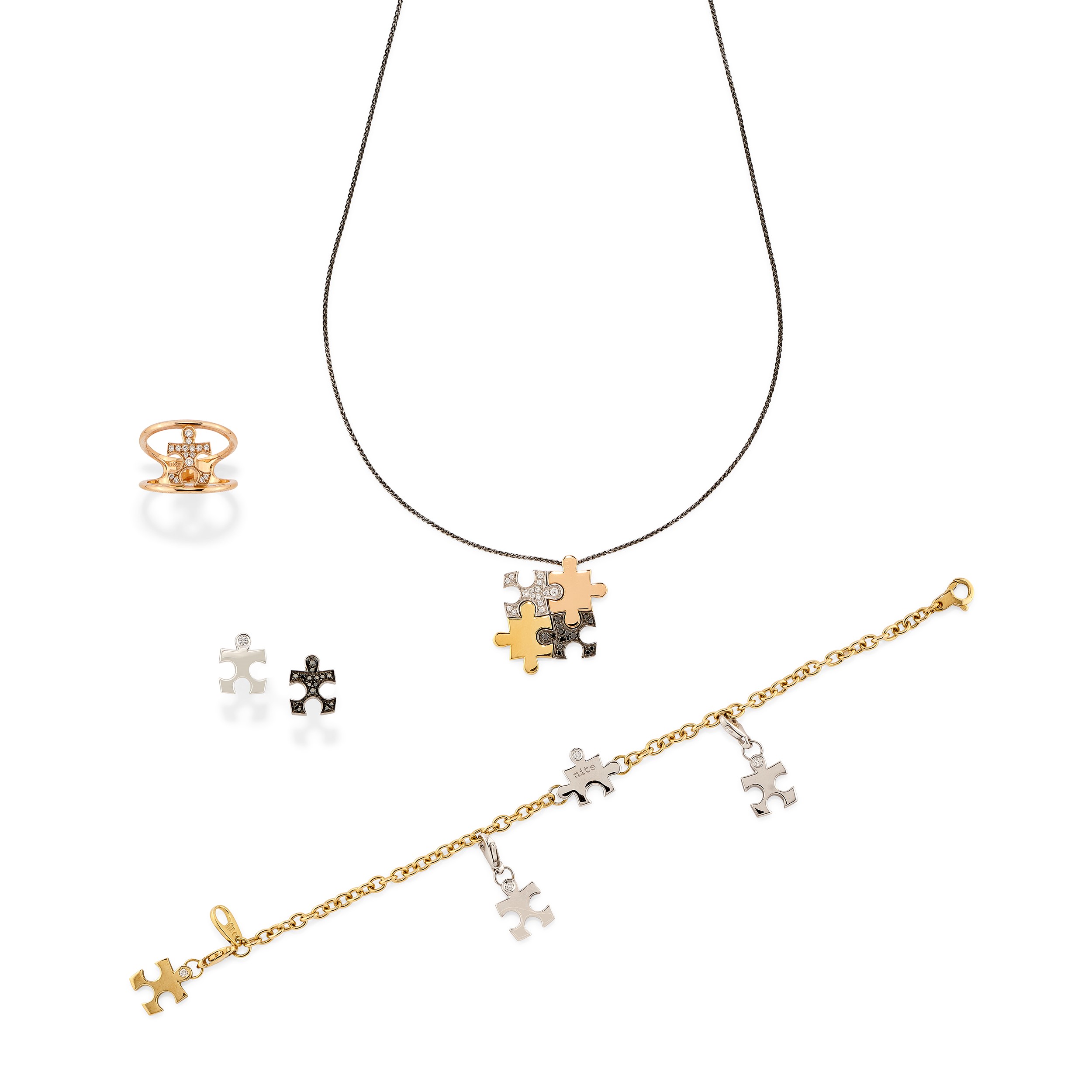 composti da un bracciale, un anello, un pendente con catena e due orecchini singoli, con motivo a puzzle impreziosito da diamanti taglio brillante incolori e neri. Peso g 30,10 misura 15 bracciale cm 18,50