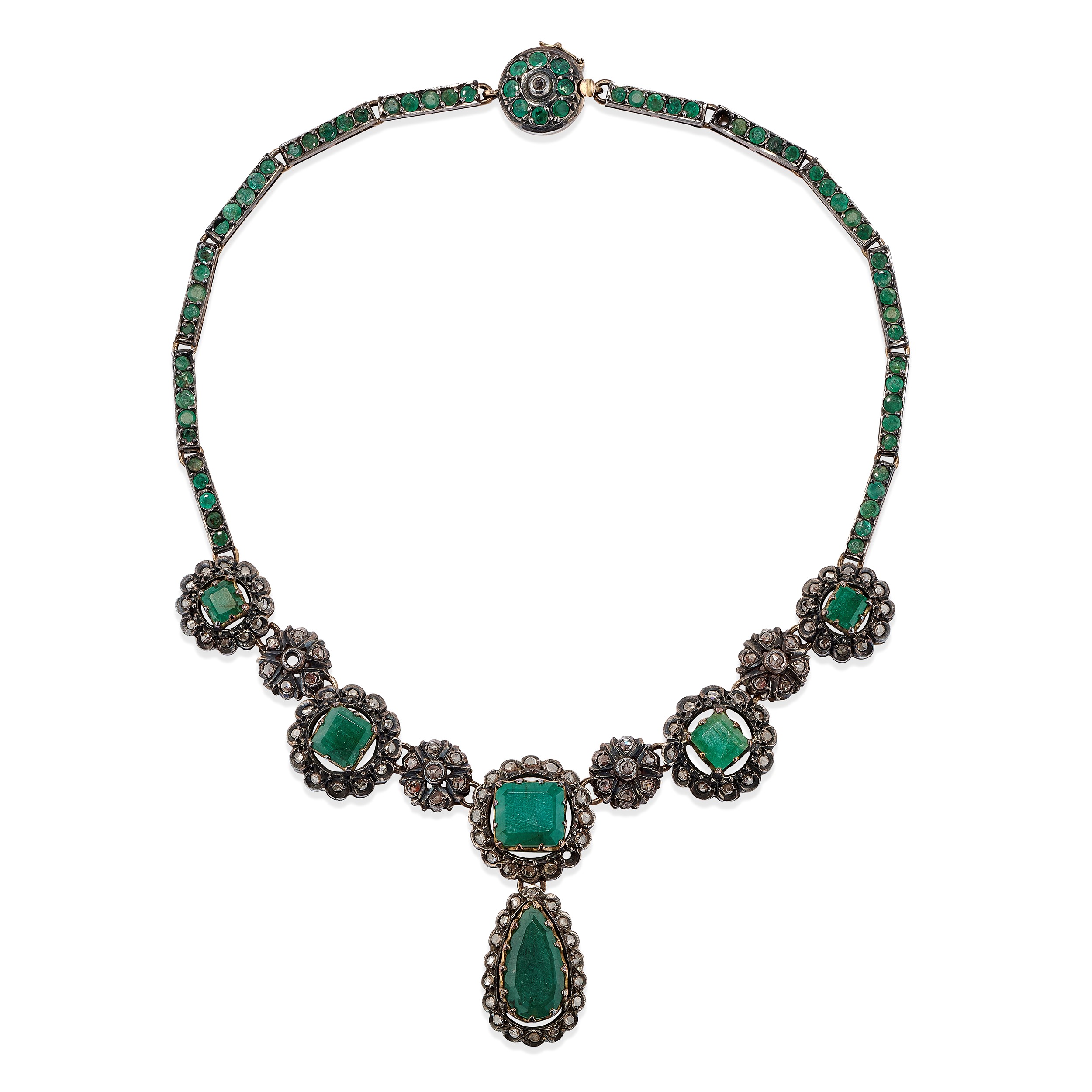 realizzata a bavaglino, con smeraldi taglio rotondo, goccia, rettangolare a contorno ottagonale, diamanti taglio rosa a decoro, con astuccio Gioielleria Masi Firenze, difetti (un diamante e uno smeraldo mancanti).
