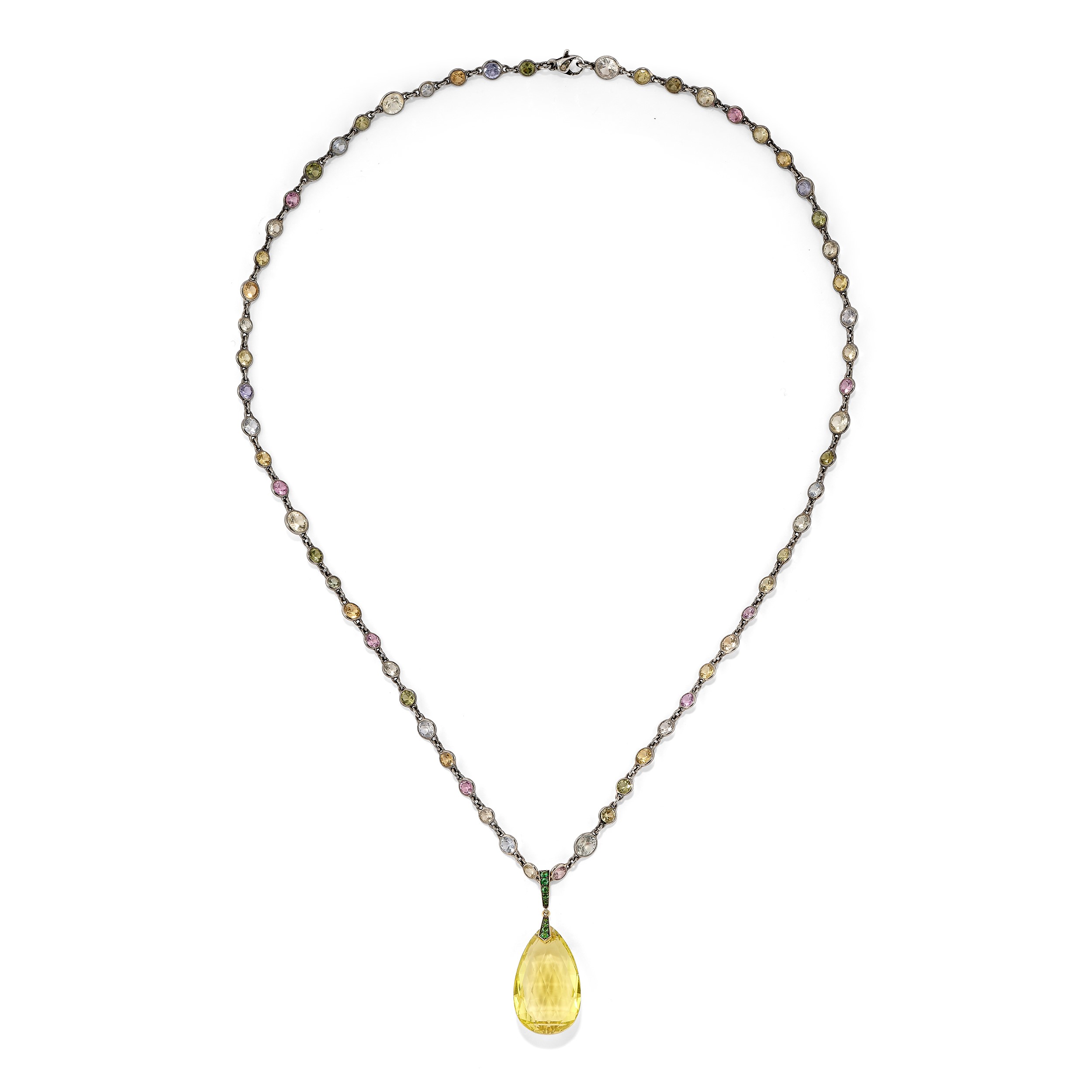 a chatelaine con zaffiri multicolor taglio rotondo per totale ct 16,00 circa e pendente con quarzo citrino taglio ovale briolette, gancio con tsavoriti taglio rotondo per totale ct 0,15 circa, con astuccio.