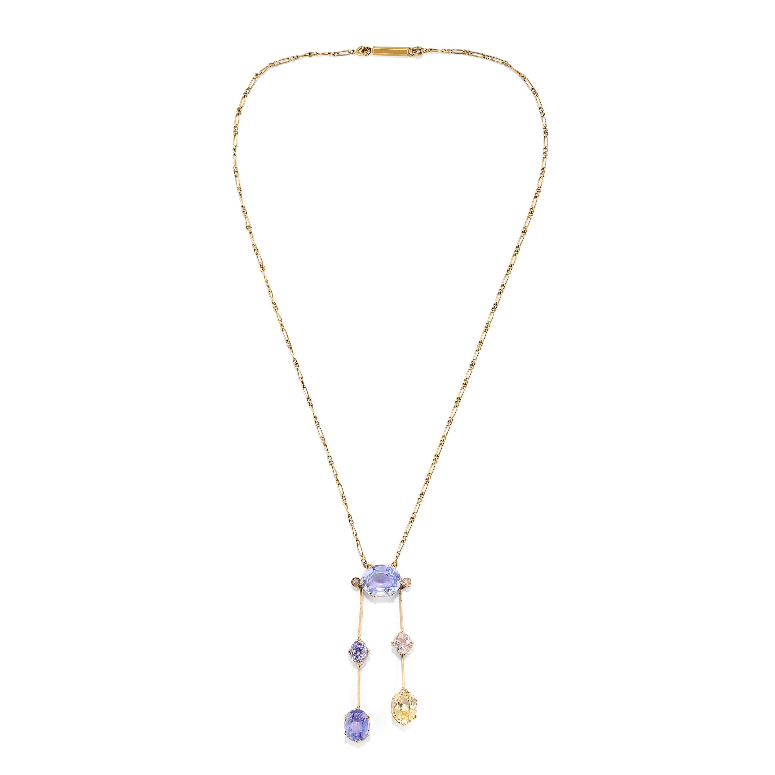 al centro motivo frangiato trattenente zaffiri Ceylon taglio cuscino nei colori blu, giallo, viola chiaro e viola rosa per totale ct 15,60.
