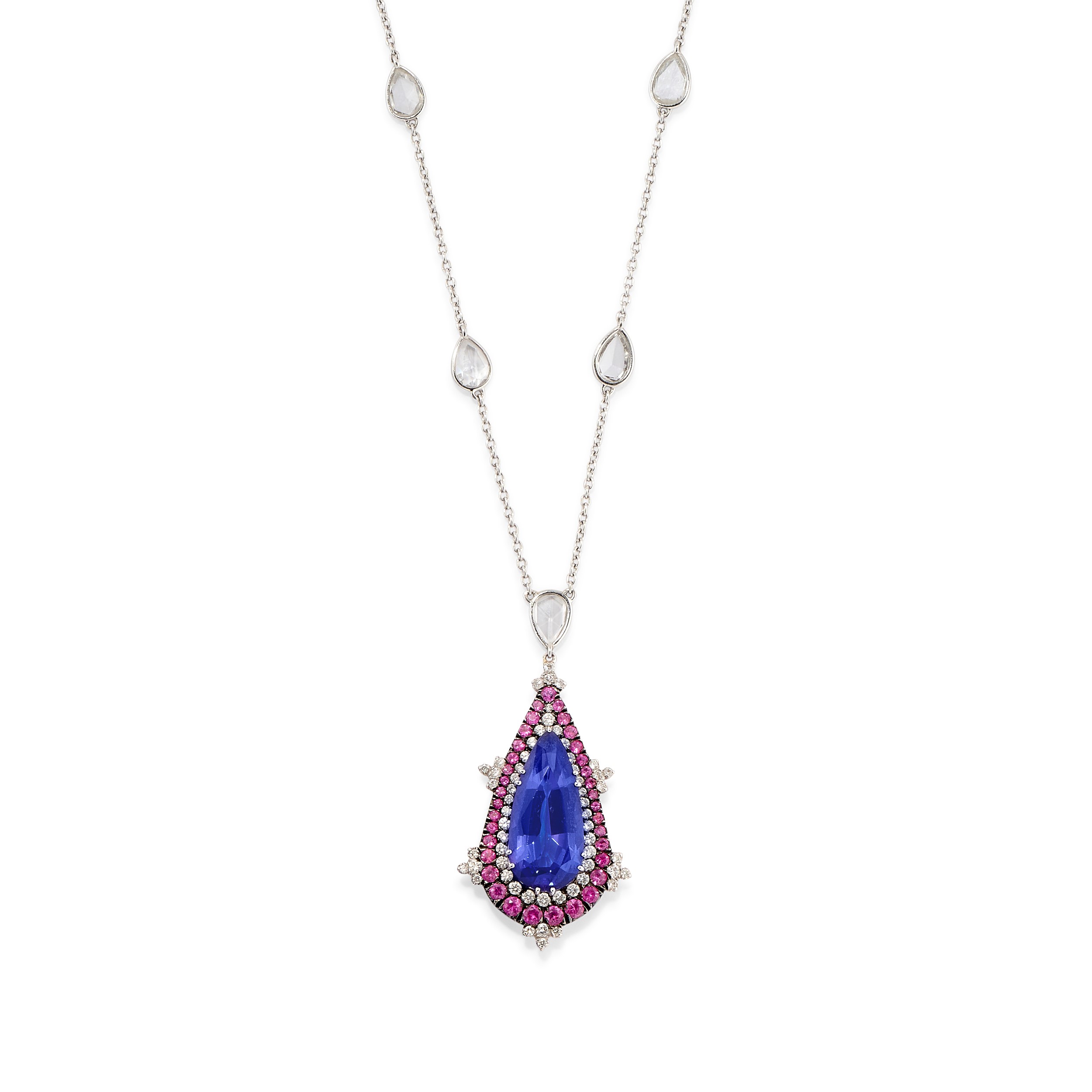 realizzata in stile gotico, pendente con tanzanite taglio goccia di ct 7,00 circa, contorno in diamanti taglio brillante per totale ct 1,50 circa e zaffiri rosa taglio rotondo, chatelaine con diamanti taglio rosa per totale ct 3,60 circa.